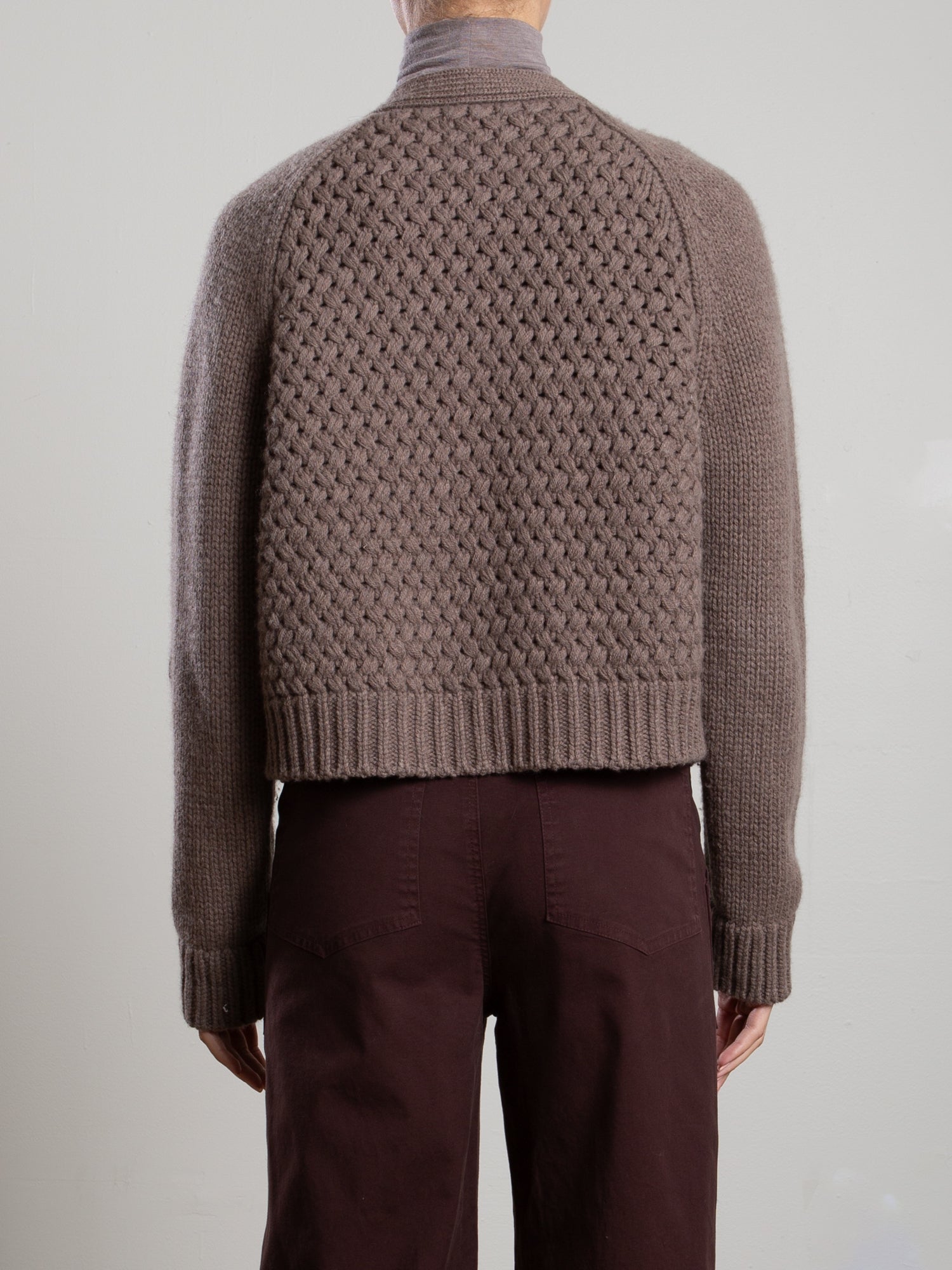 Cozy wool-cashmere with a crossover basket-weave stitch on the body. Features chunky knitting and rib accents.