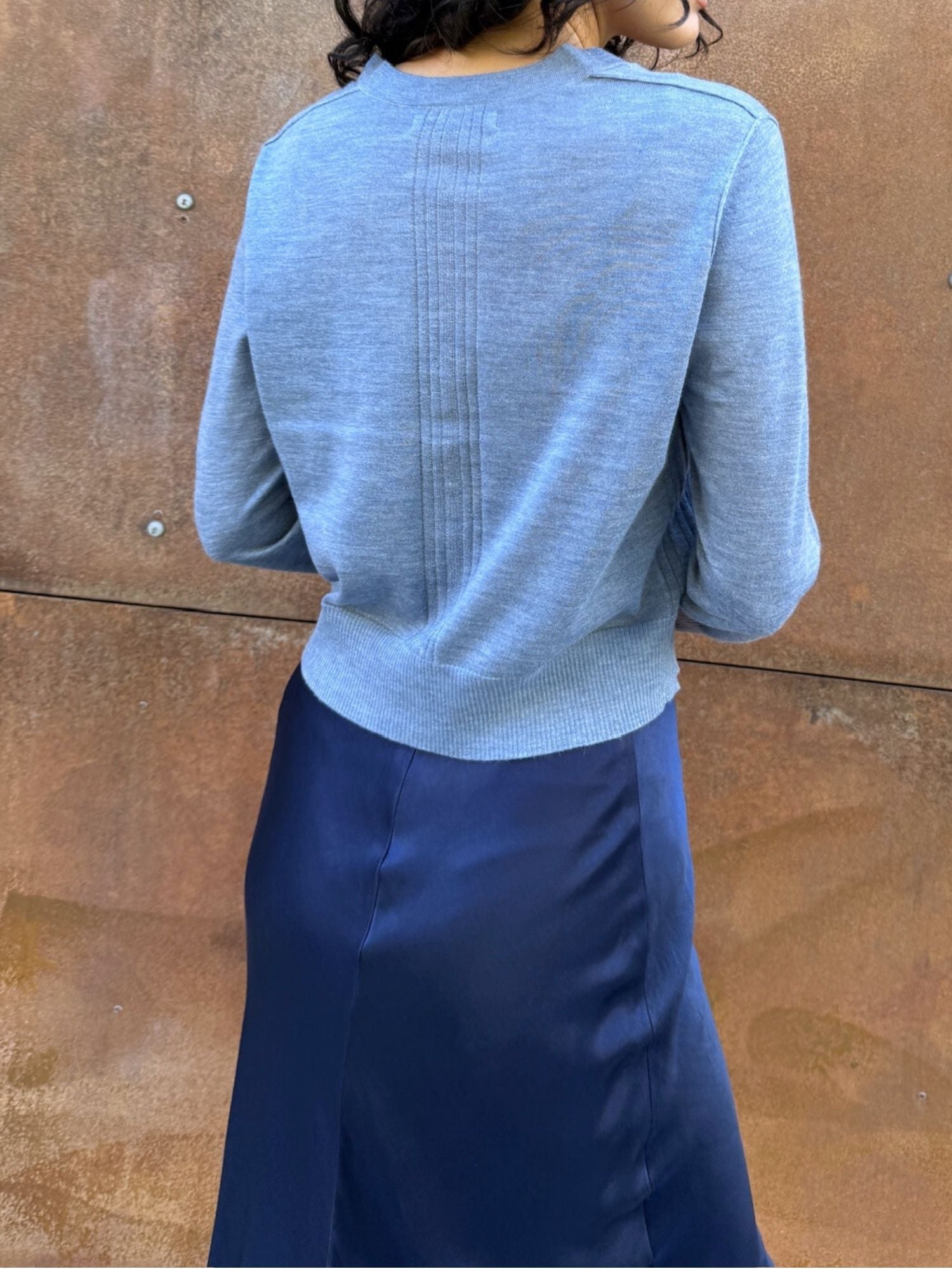 Remy is a semi-fitted, cropped cardigan with exposed seams and contrast stitching for added dimension. Wear alone as a top or layered over lightweight rib essentials like Cass or Athena.
