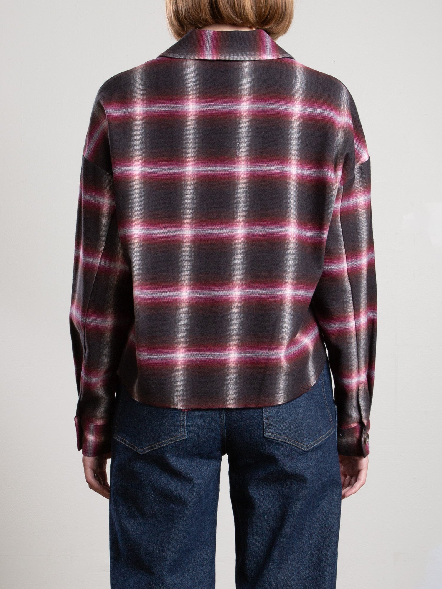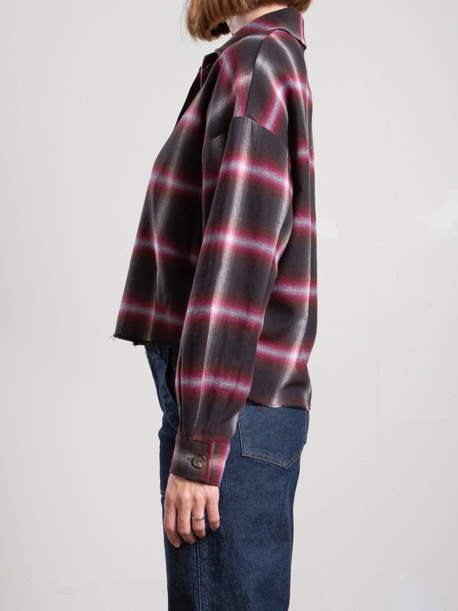 Relaxed fit cropped shirt cut from a brushed cotton plaid imported from Japan. Features a raw edge hem.