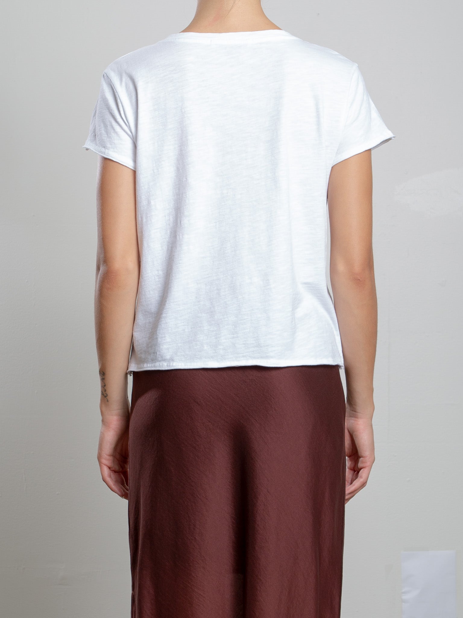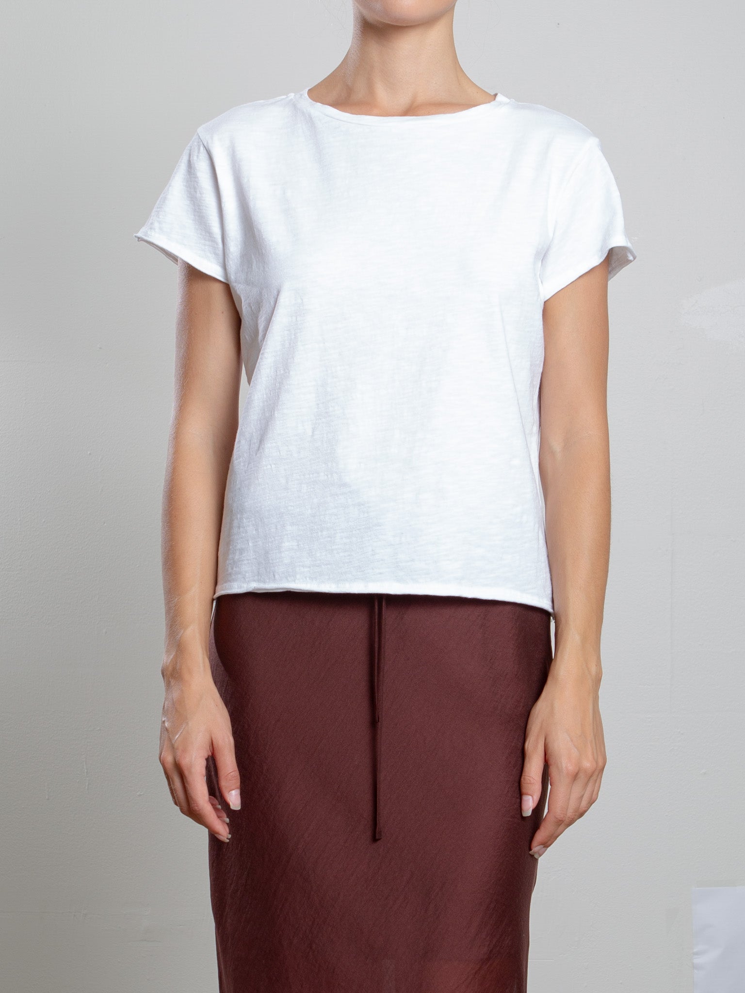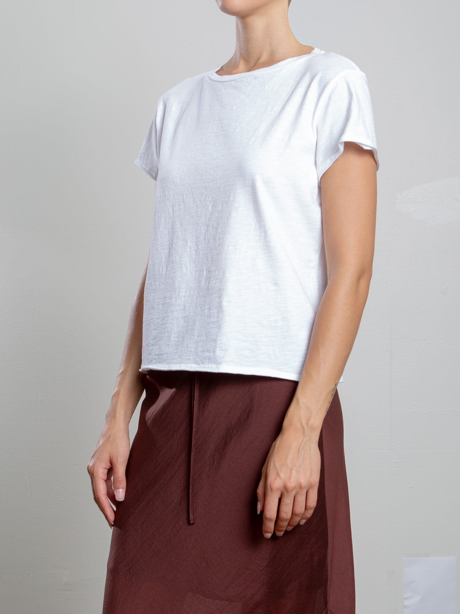 Boxy crop tee with open neck and raw edge finishes.