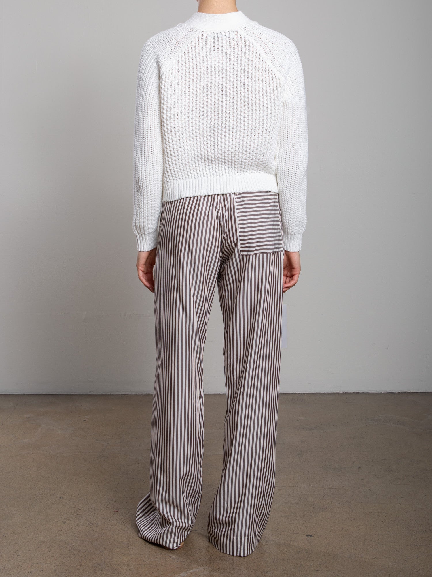 - Single back patch pocket in contrasting stripe direction