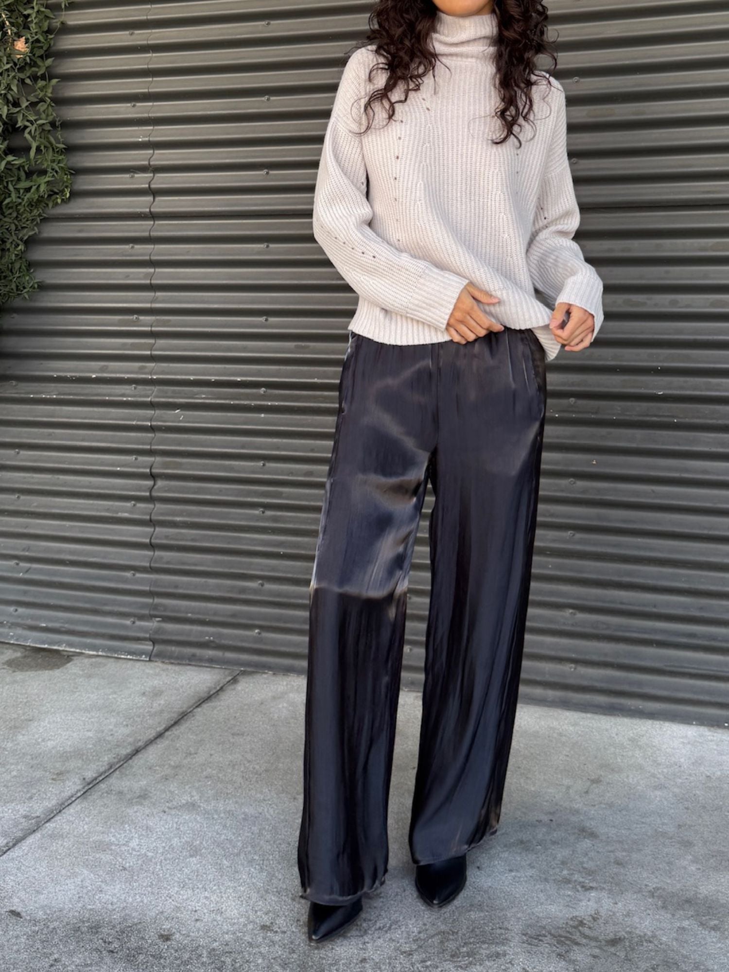 Wide-leg pant with forward seams and hidden pockets. Fully elasticized waist. Crinkle fabric with soft shine.