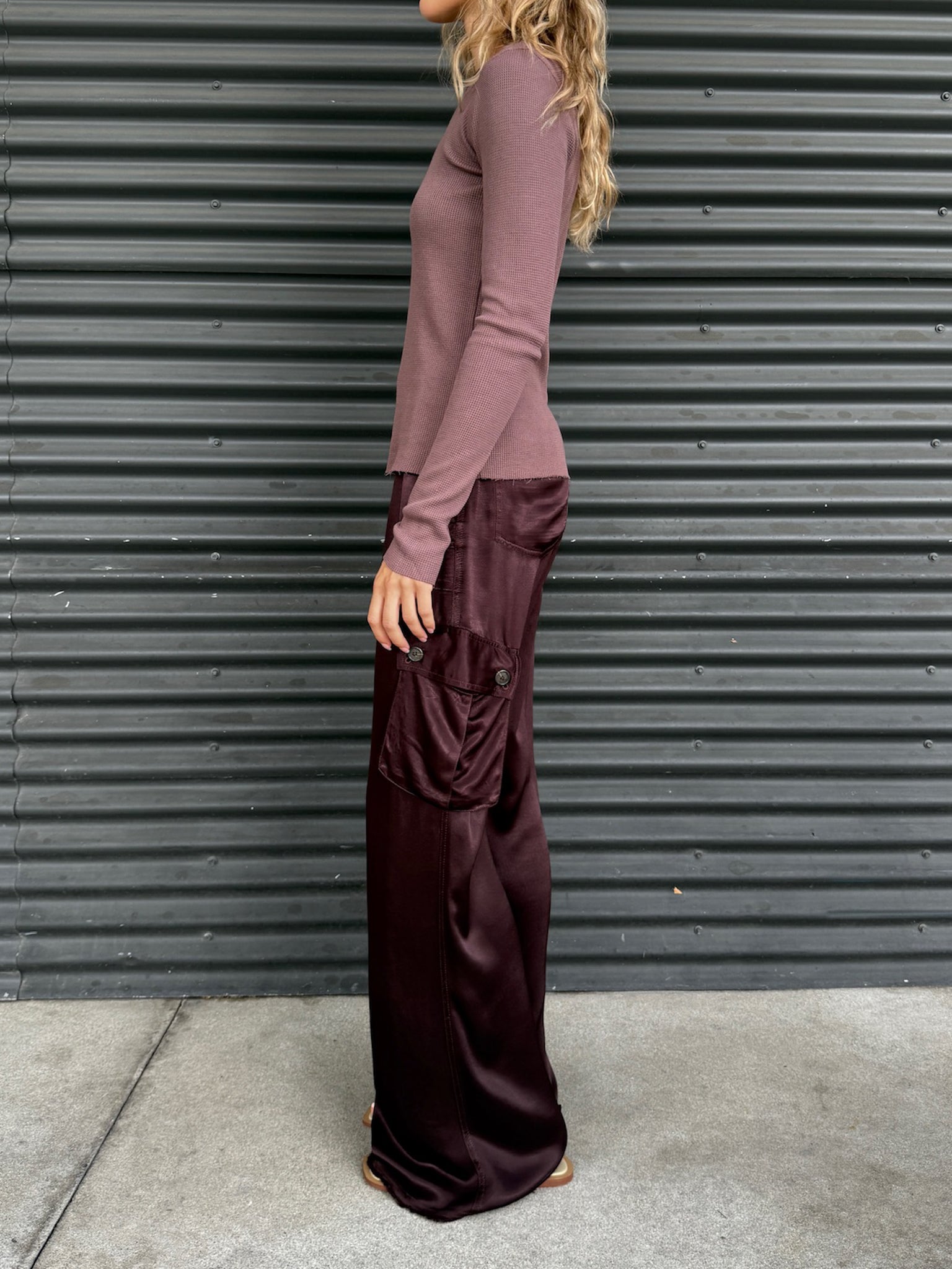 Mason blends a utilitarian feel with lux Vintage Satin for an elevated take on the cargo silhouette. This pant is full length with wide legs and angled side cargo pockets.