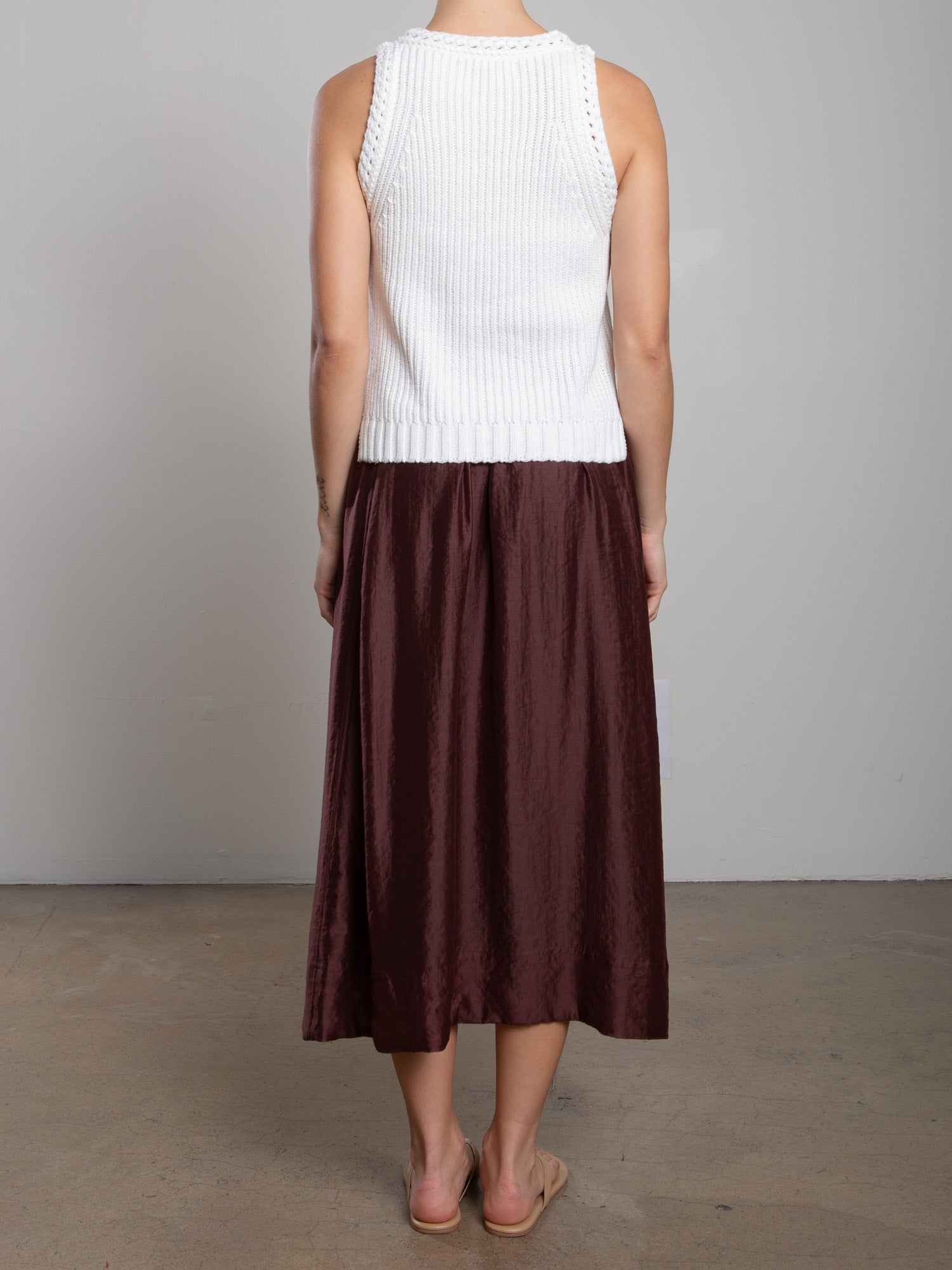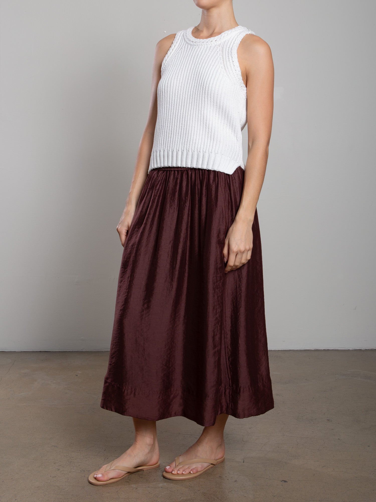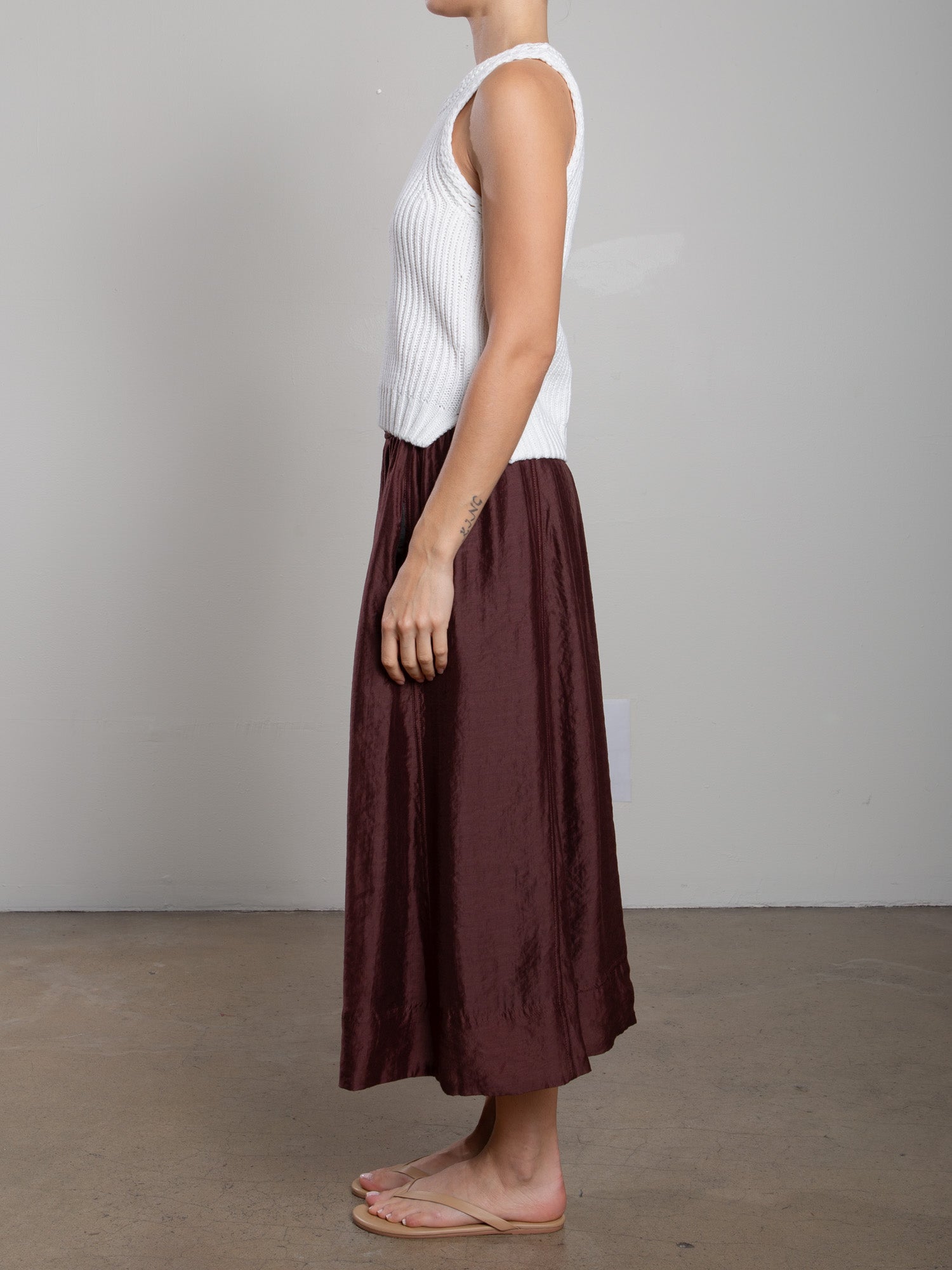 Full midi skirt with side panel detailing and elastic waist.