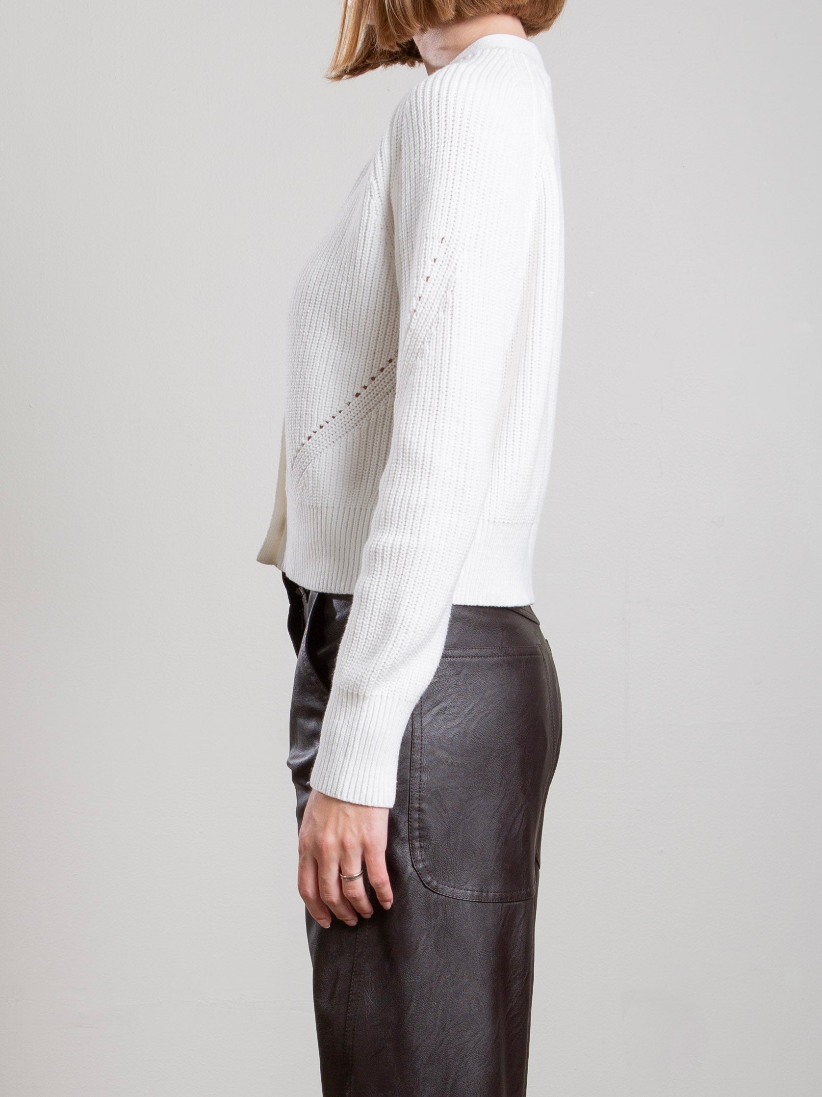 A chunky pointelle detail cardigan made with small batch dyed cotton yarn. Ribbed detailing on neckline & sleeve. Cropped boxy fit.