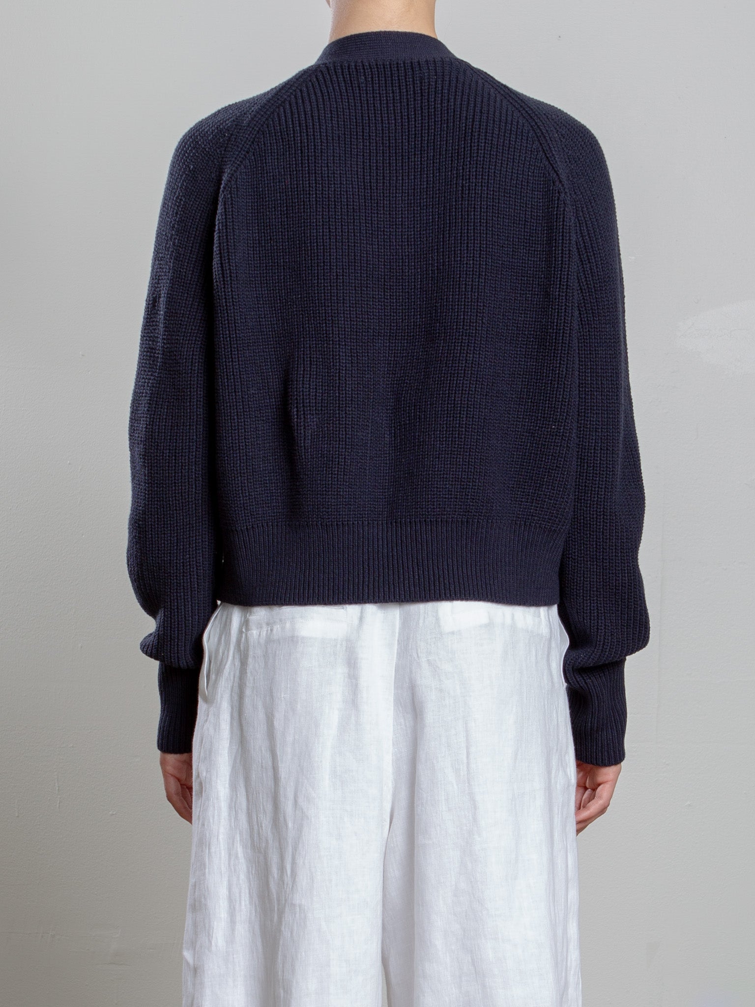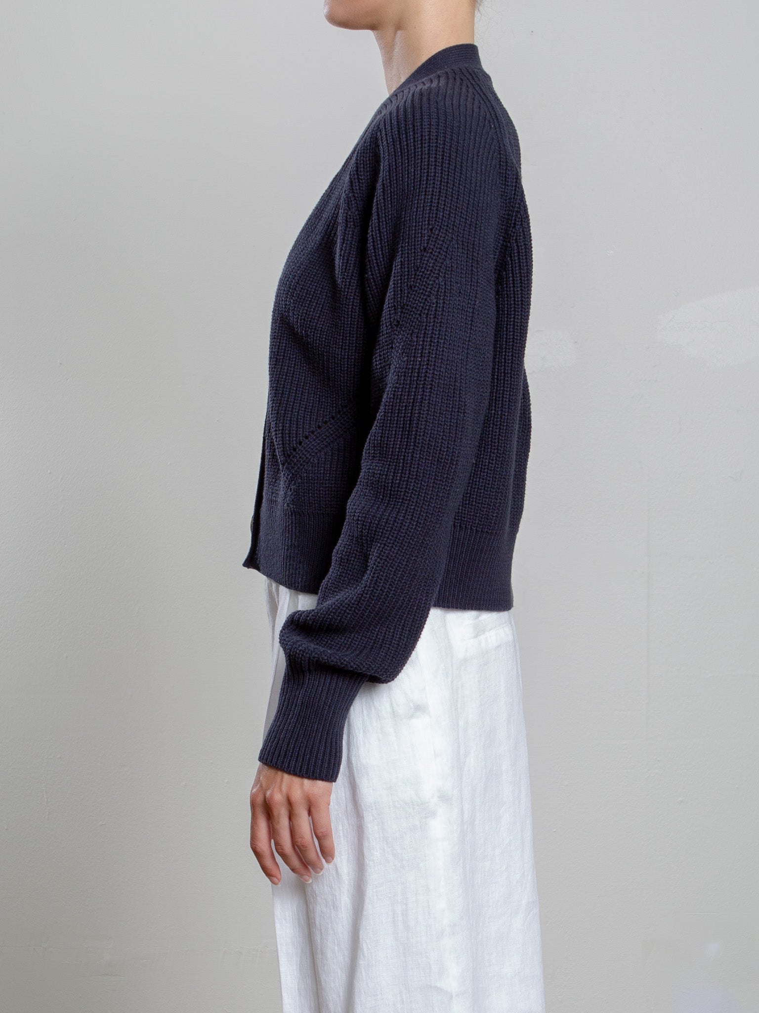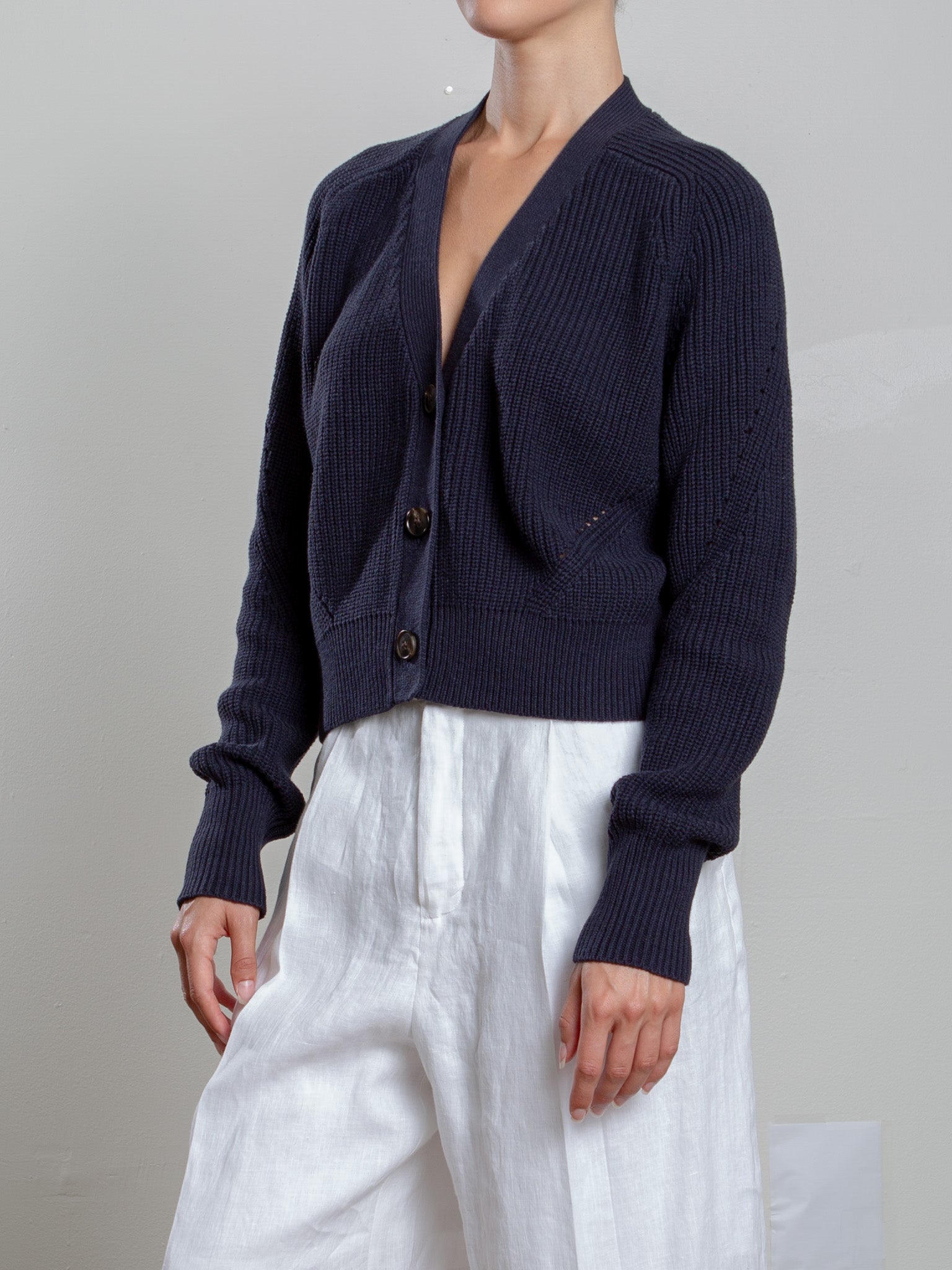 A chunky pointelle detail cardigan made with small batch dyed cotton yarn. Ribbed detailing on neckline & sleeve. Cropped boxy fit.