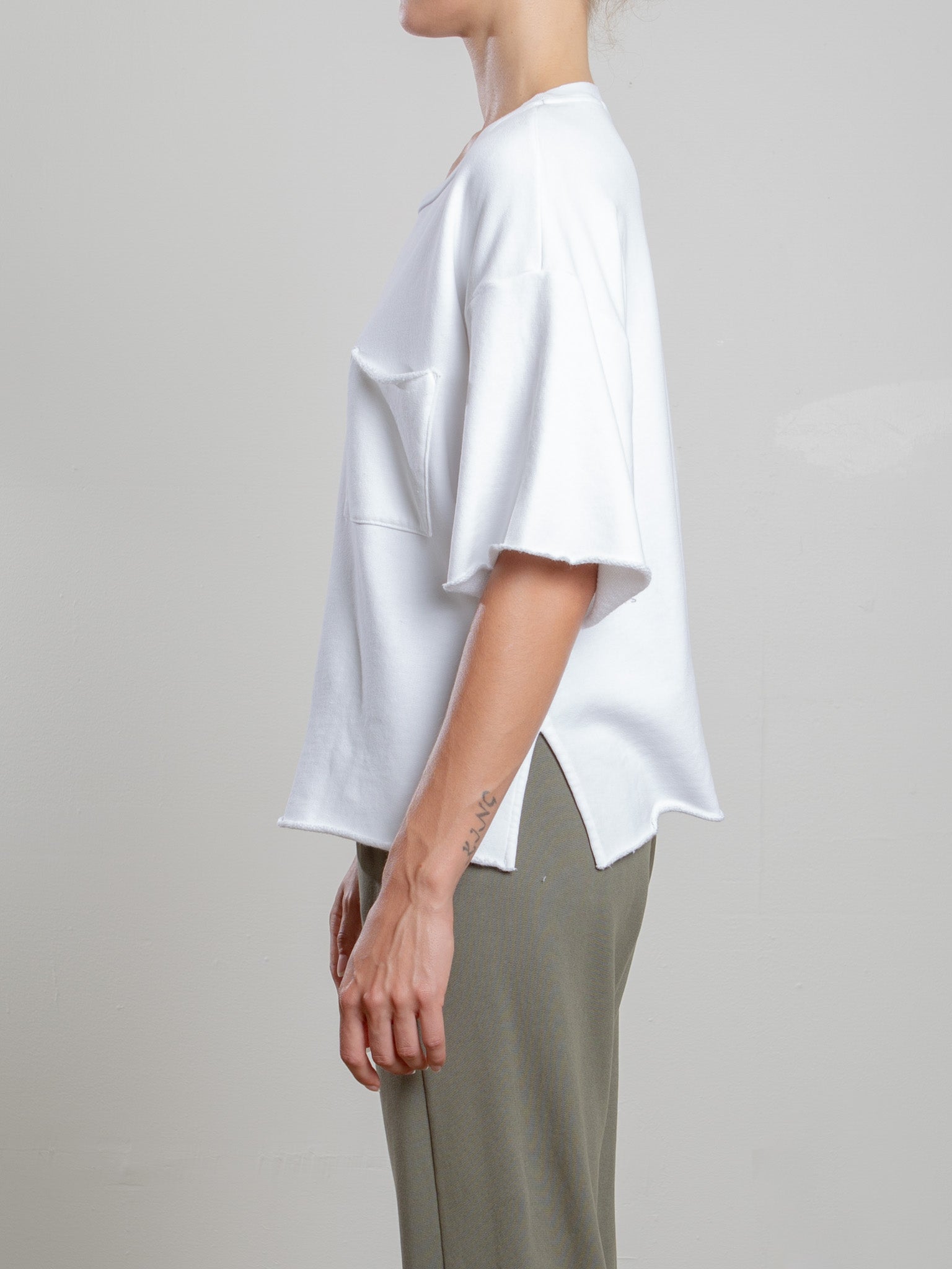 Oversized short sleeve sweatshirt with singe chest pocket and raw edges. Made in Los Angeles.