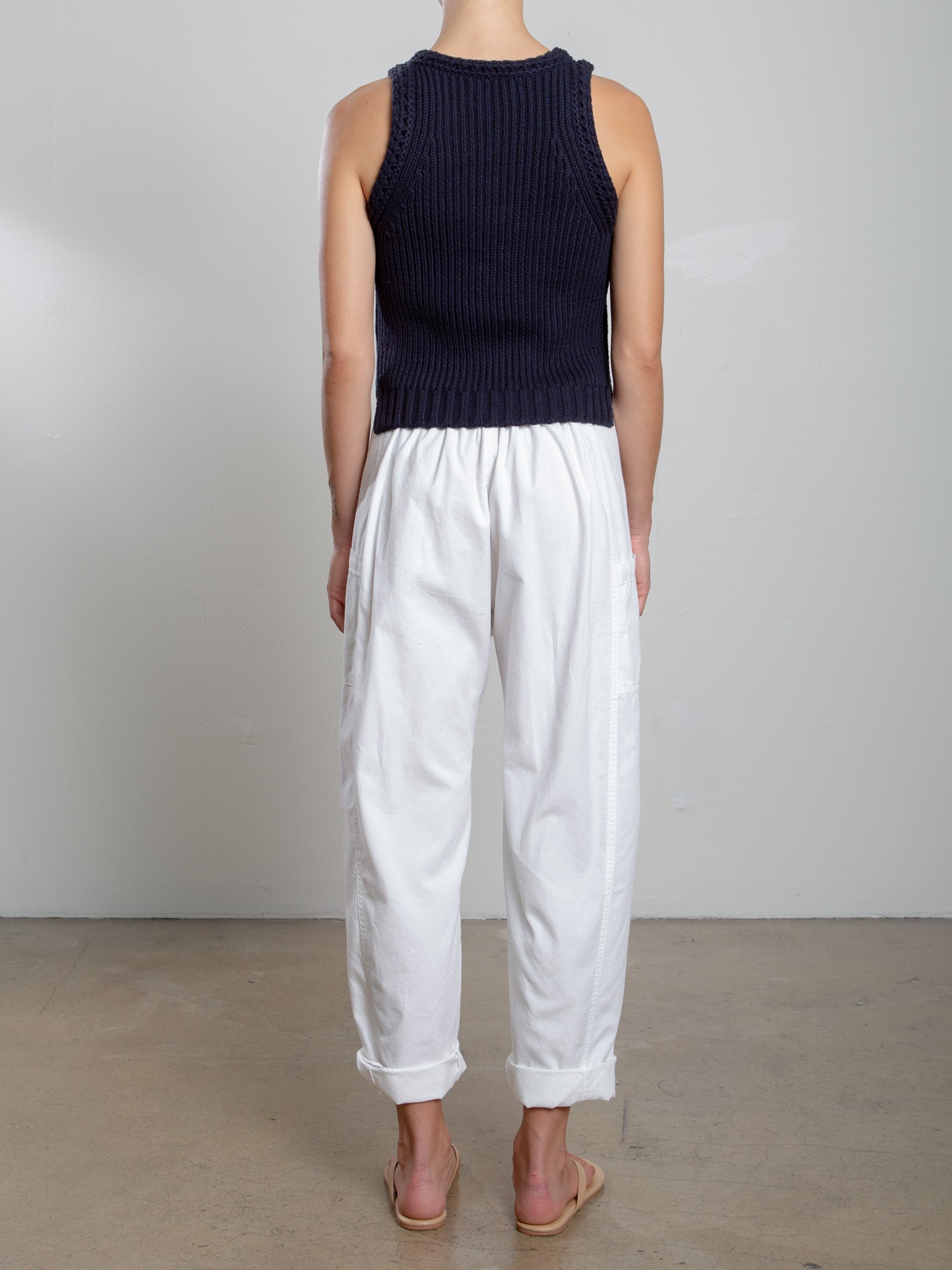 Paneled slight barrel-leg pant with elasticized back waist for ease of wear. Roll up the hem for an ankle fit or leave unrolled for added length.