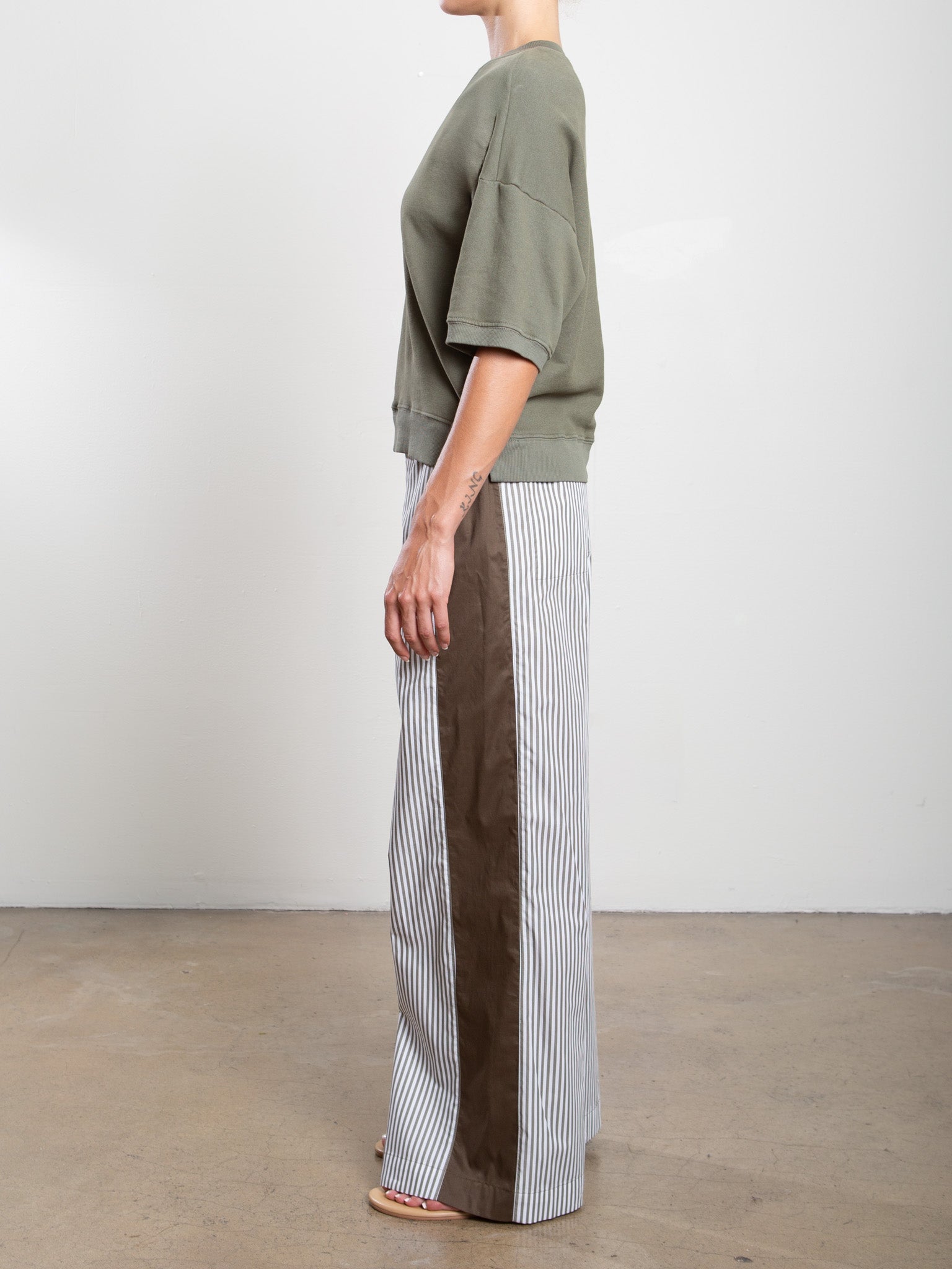 Wide-leg trouser in striped cotton poplin with solid side panel. Has a clean front waistband and elastic in back for ease of wear.