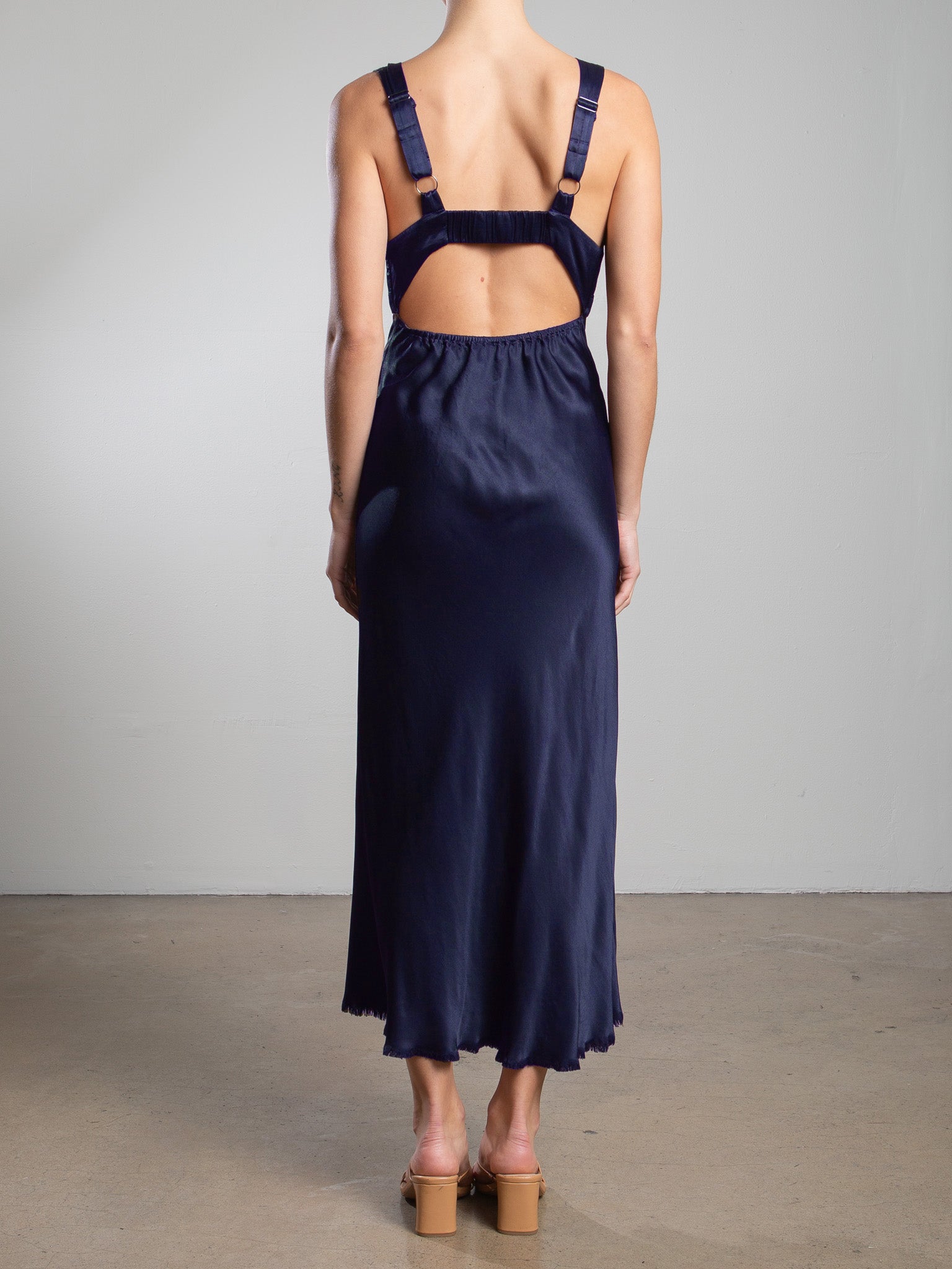 Midi dress with cut-out back and adjustable straps. Has raw edge detailing throughout. Pull-on styling with elastic in back.