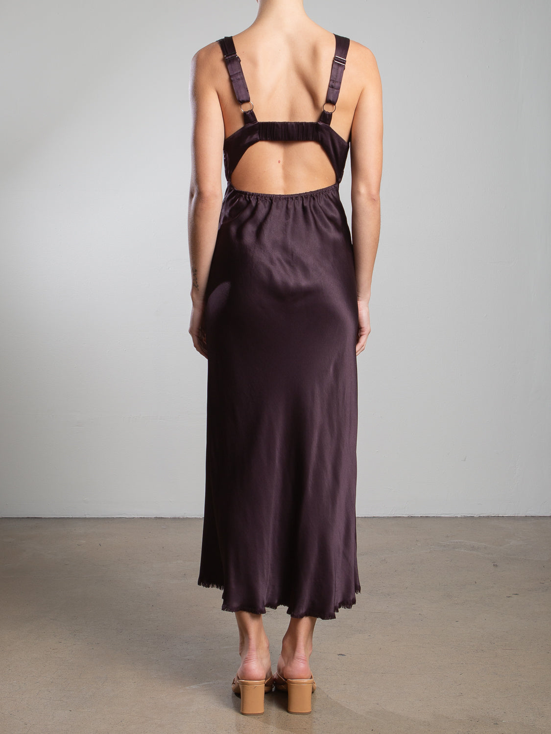 Midi dress with cut-out back and adjustable straps. Has raw edge detailing throughout. Pull-on styling with elastic in back.
