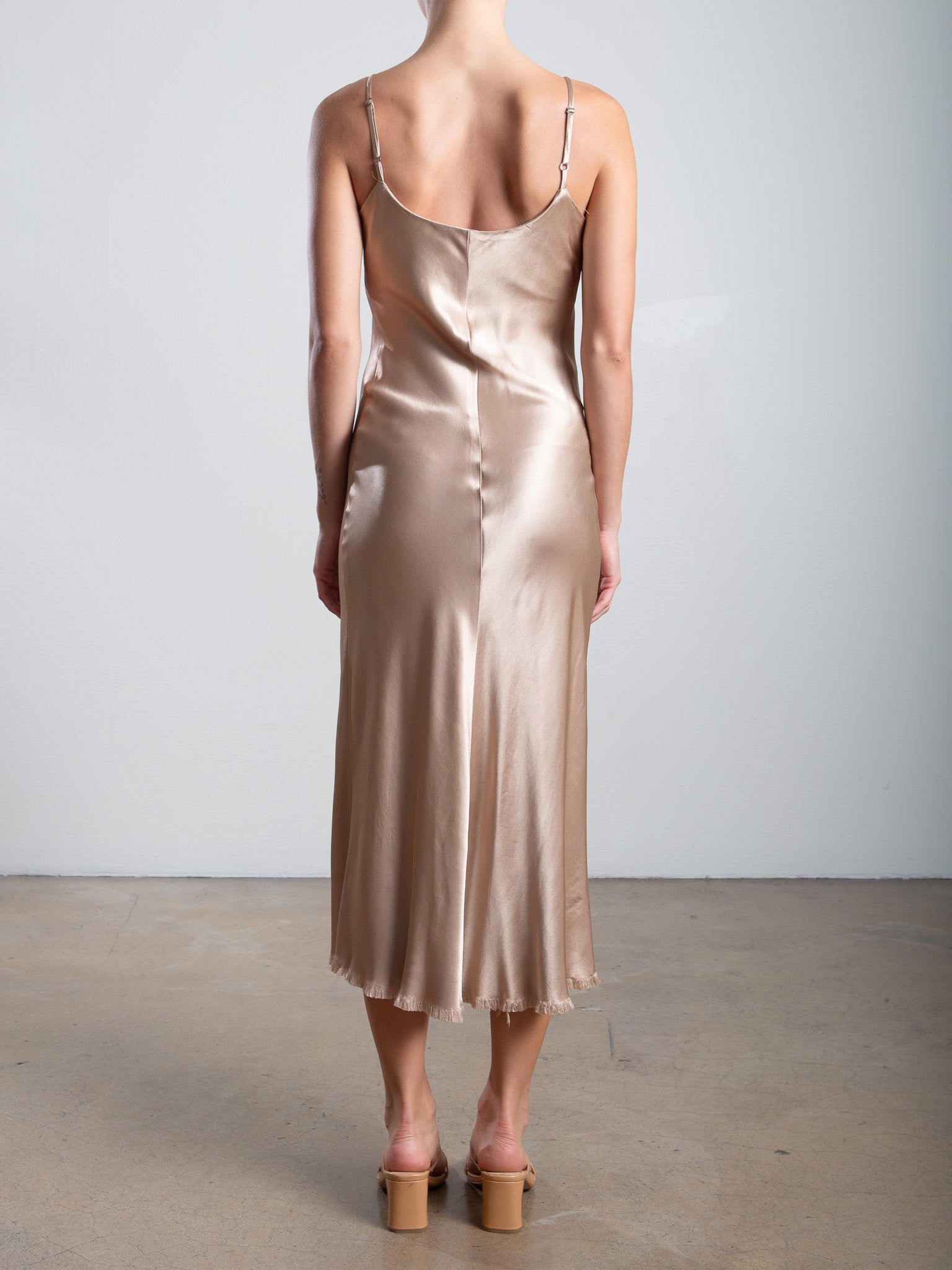 The perfect effortless piece! Garment dyed to create a vintage satin look and worn-in feel. This dress is cut on the bias and falls nicely on a lot of different body types. There is a raw edge trim in front of neckline as well as a fringe hem detail.