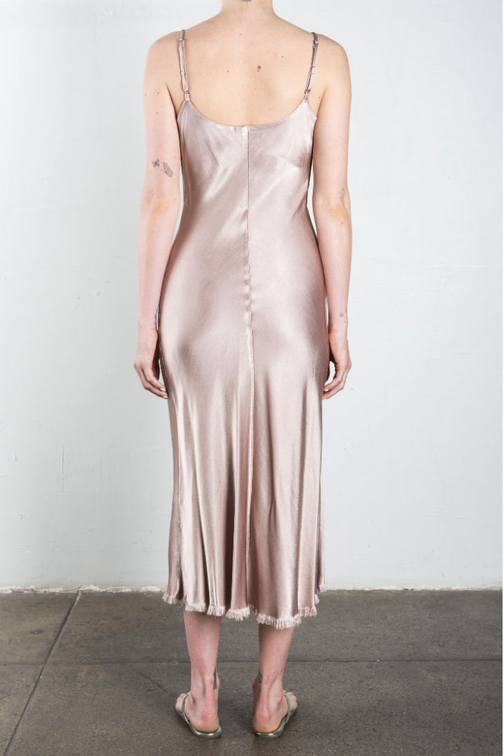 The perfect effortless piece! Garment washed to create a vintage satin looking worn-in feel. This dress is cut on the bias and falls nicely on a lot of different body types. There is a raw edge trim in front of neckline as well as a fringe hem detail. Machine washable, 100% rayon hang to dry ( Seriously - how can you get any better that this added benefit!)