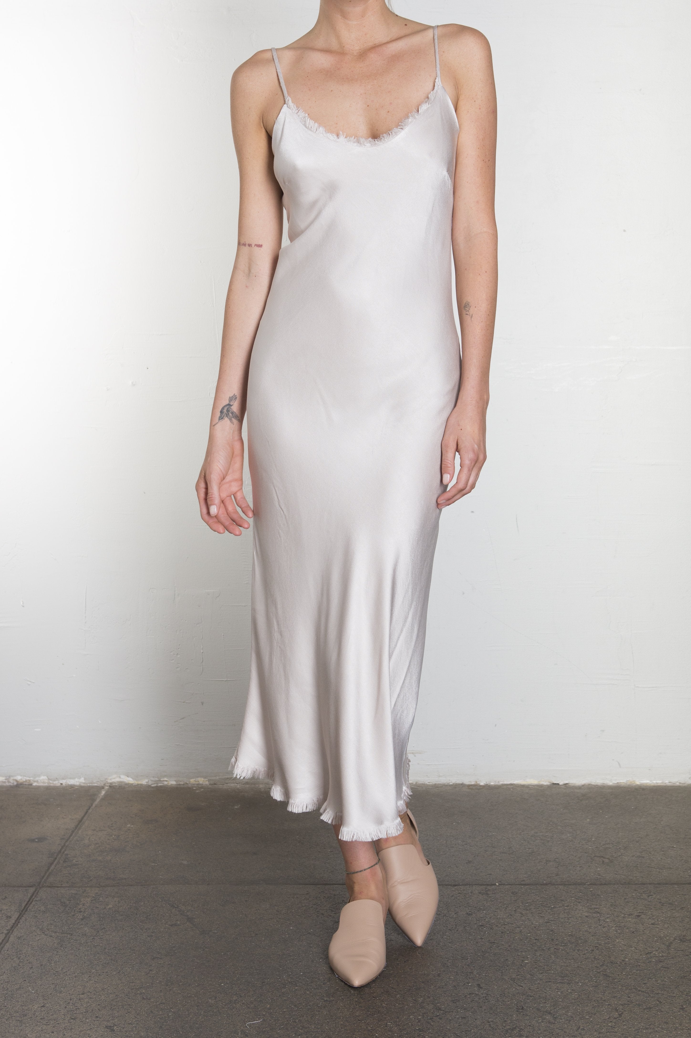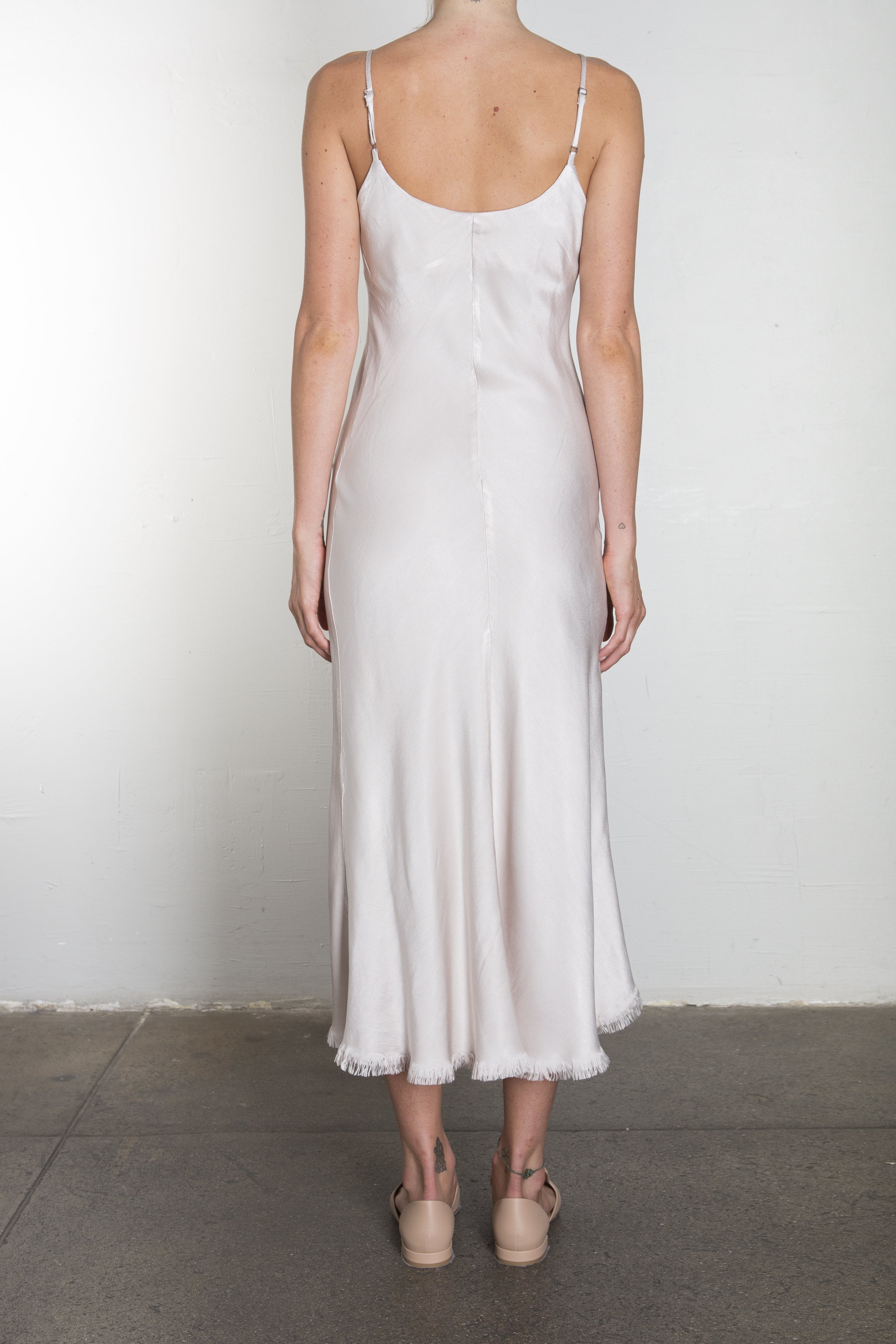 The perfect effortless piece! Garment washed to create a vintage satin looking worn-in feel. This dress is cut on the bias and falls nicely on a lot of different body types. There is a raw edge trim in front of neckline as well as a fringe hem detail.