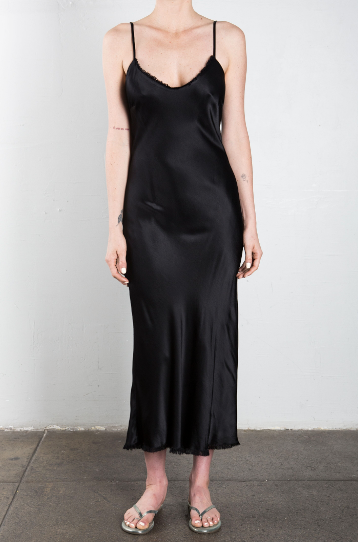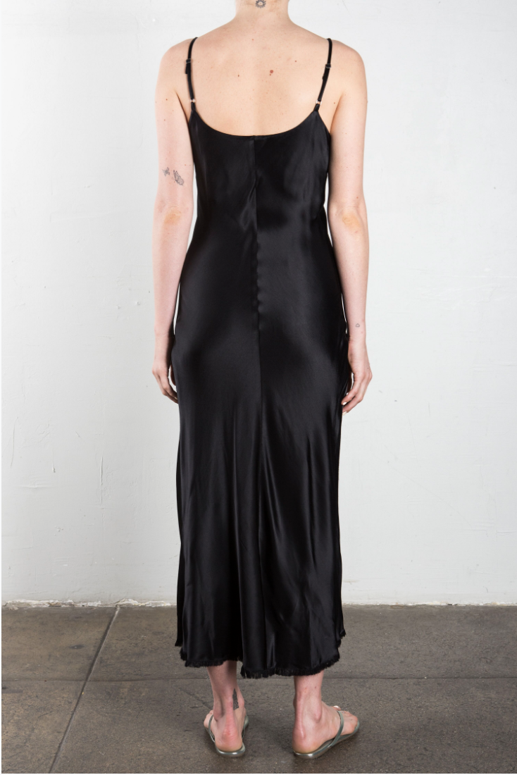 The perfect effortless piece! Garment washed to create a vintage satin looking worn-in feel. This dress is cut on the bias and falls nicely on a lot of different body types. There is a raw edge trim in front of neckline as well as a fringe hem detail. 100% rayon - dry clean recommended. Model is 5'9", typically wears a size 25 jean and is wearing a size 1.