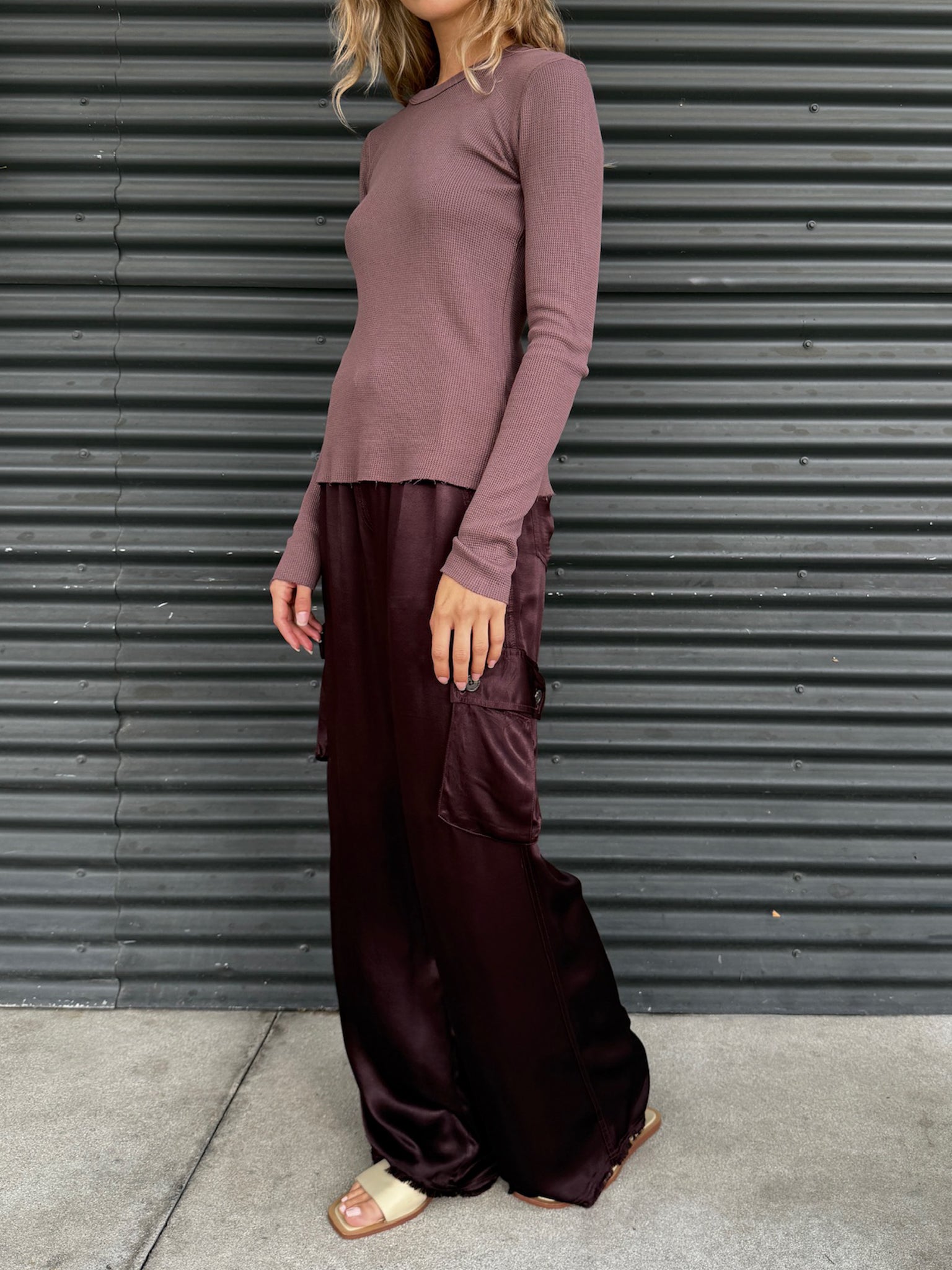 Mason blends a utilitarian feel with lux Vintage Satin for an elevated take on the cargo silhouette. This pant is full length with wide legs and angled side cargo pockets.