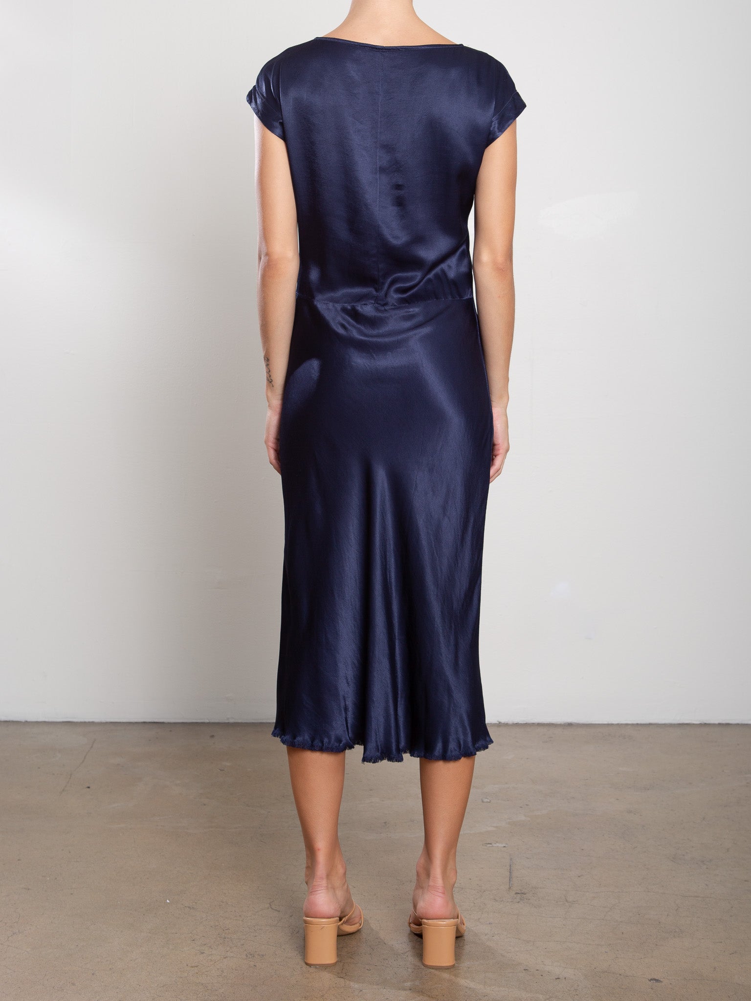 A bias-cut midi with asymmetric pleats for a naturally flattering drape. Featuring an open neckline, cap sleeves, and raw edge fringe hem.