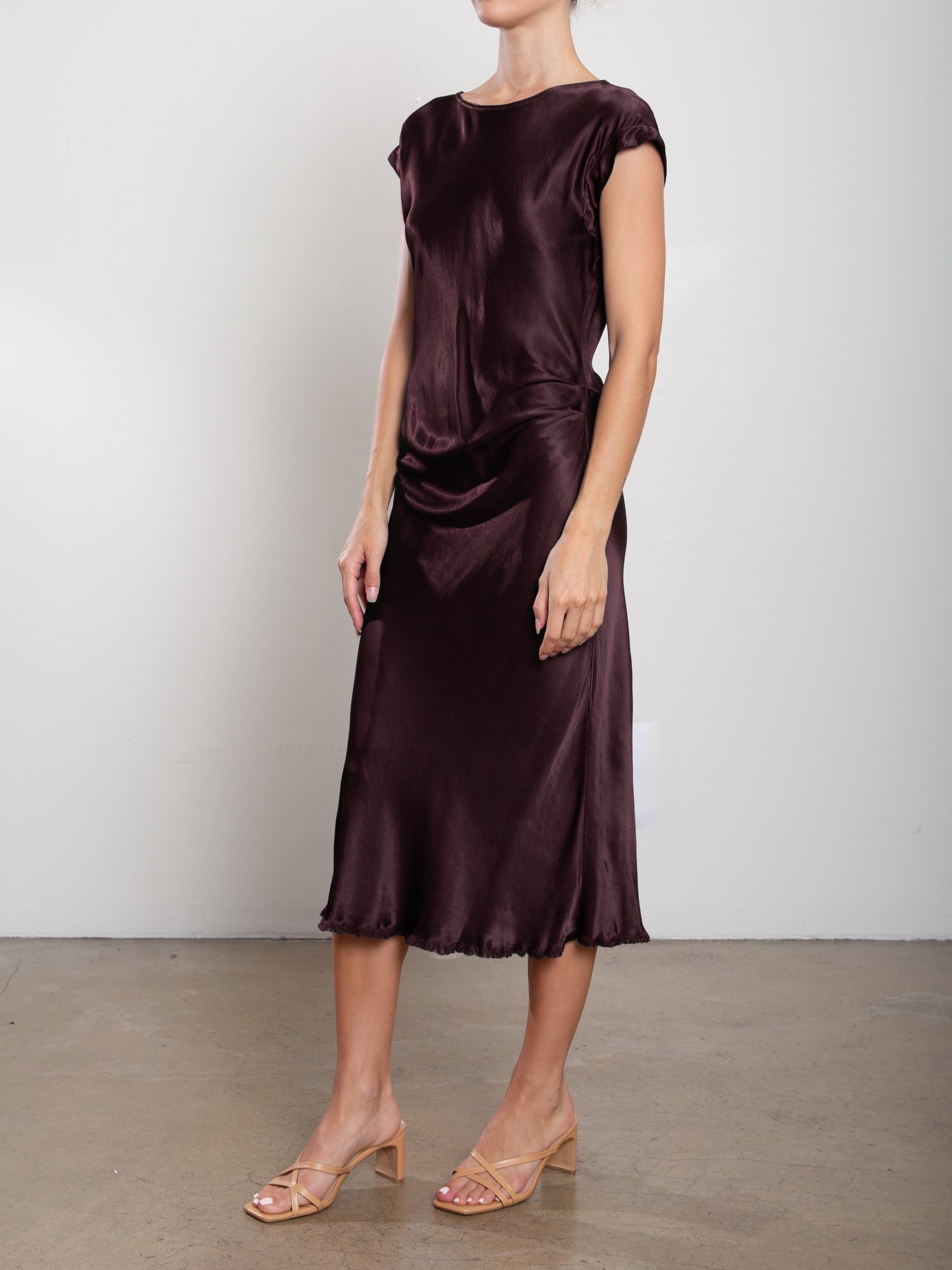 A bias-cut midi with asymmetric pleats for a naturally flattering drape. Featuring an open neckline, cap sleeves, and raw edge fringe hem.