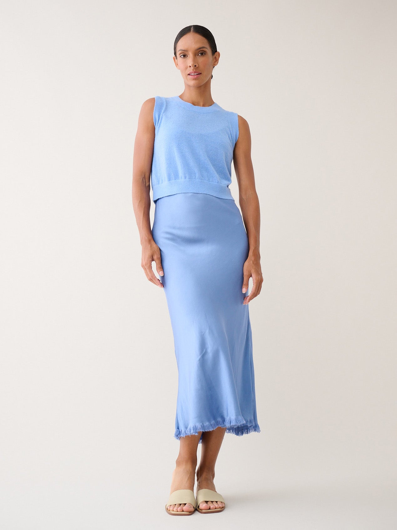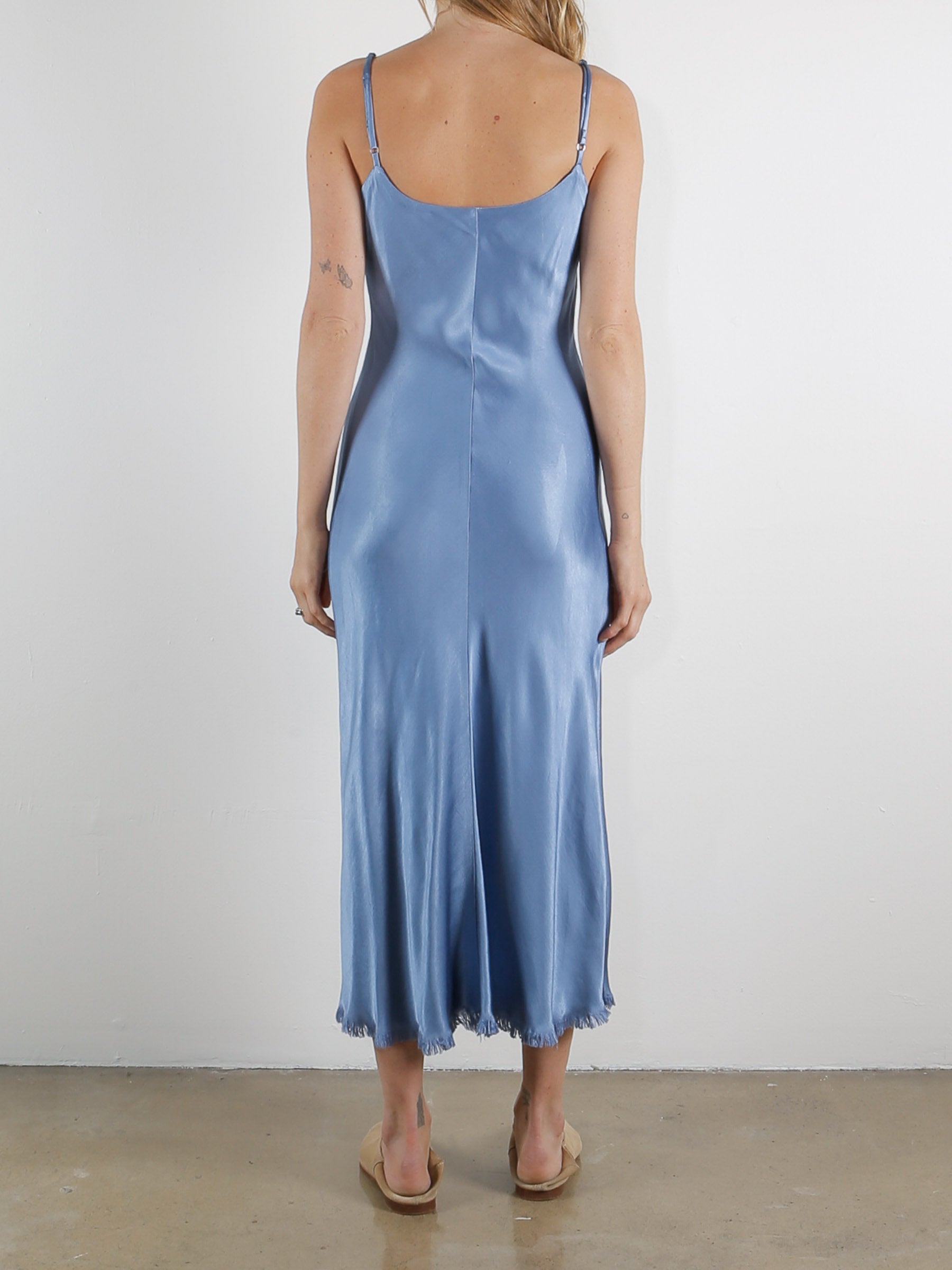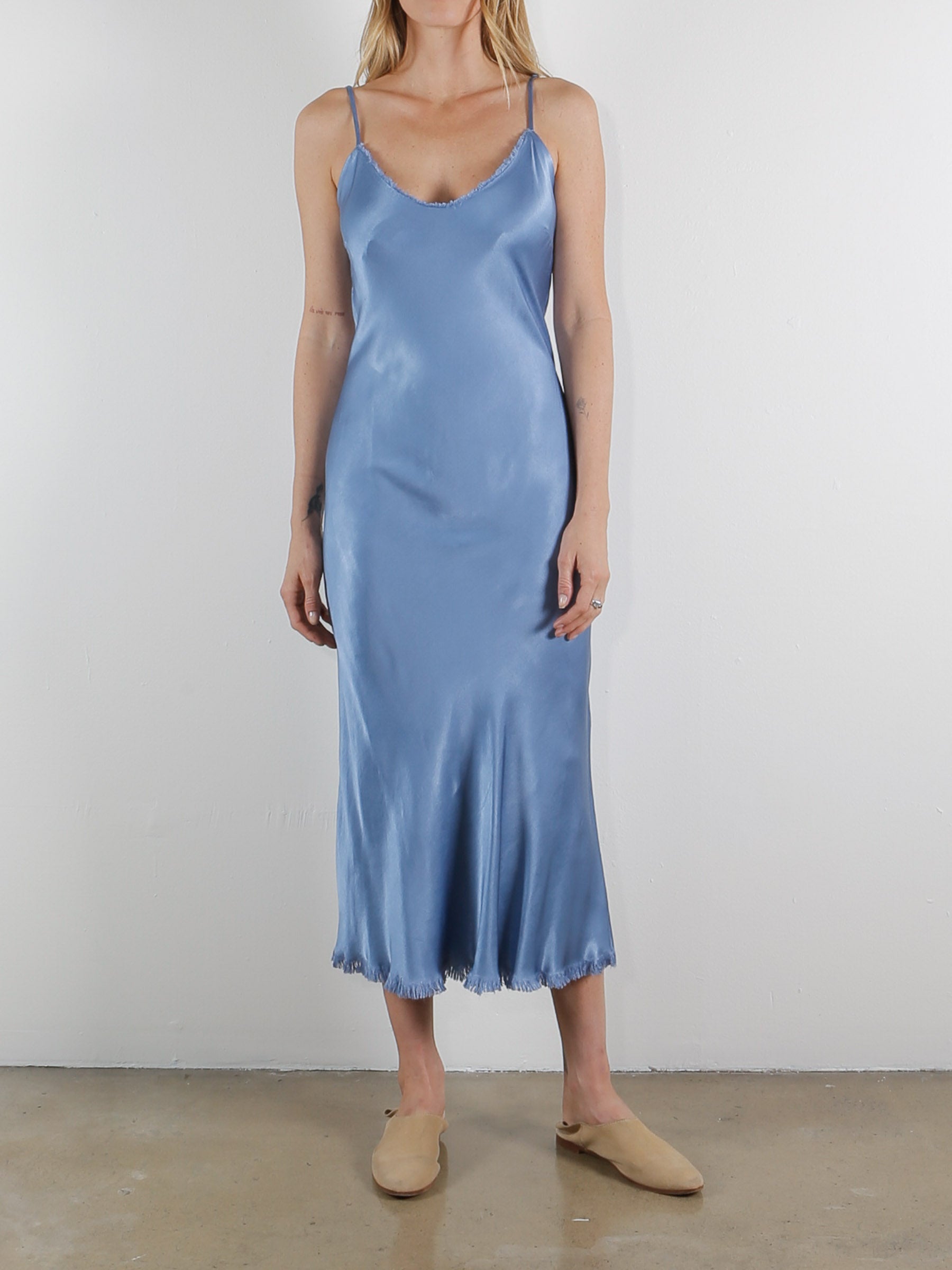 The perfect effortless piece! Garment washed to create a vintage satin looking worn-in feel. This dress is cut on the bias and falls nicely on a lot of different body types. There is a raw edge trim in front of neckline as well as a fringe hem detail.
