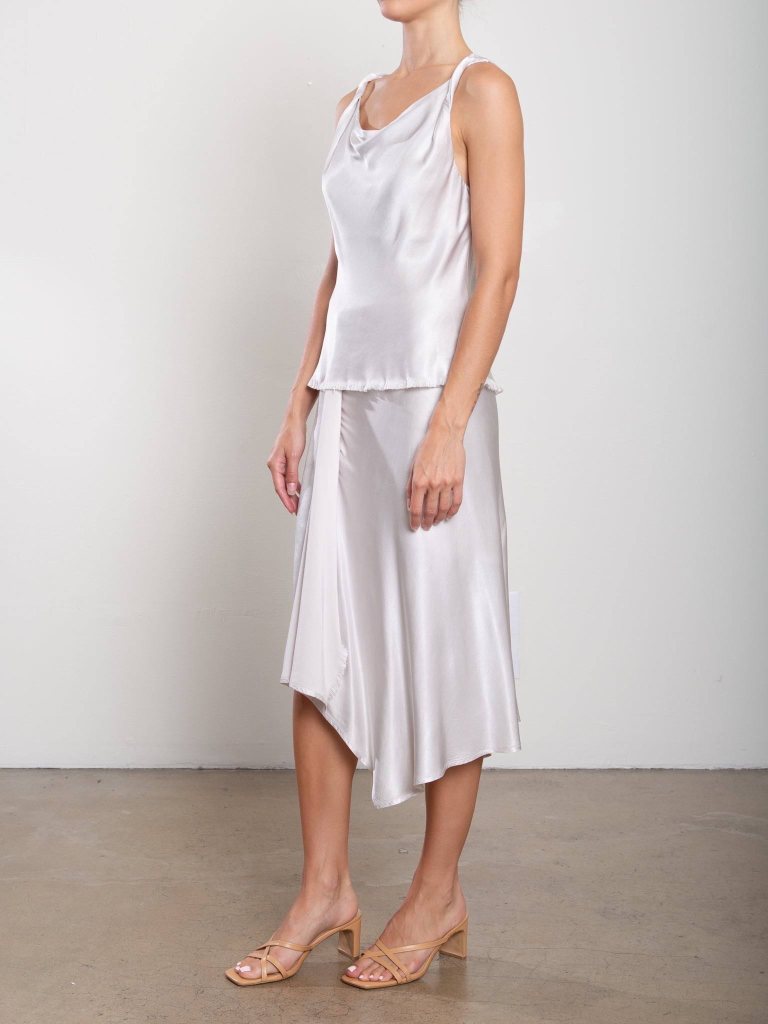 The Samara Skirt is cut with a fluid, asymmetric drape in our signature Vintage Satin. It features an elasticized waist and invisible front zip for easy wear. Finished with raw-edge fringe at the front. Lined for extra coverage.