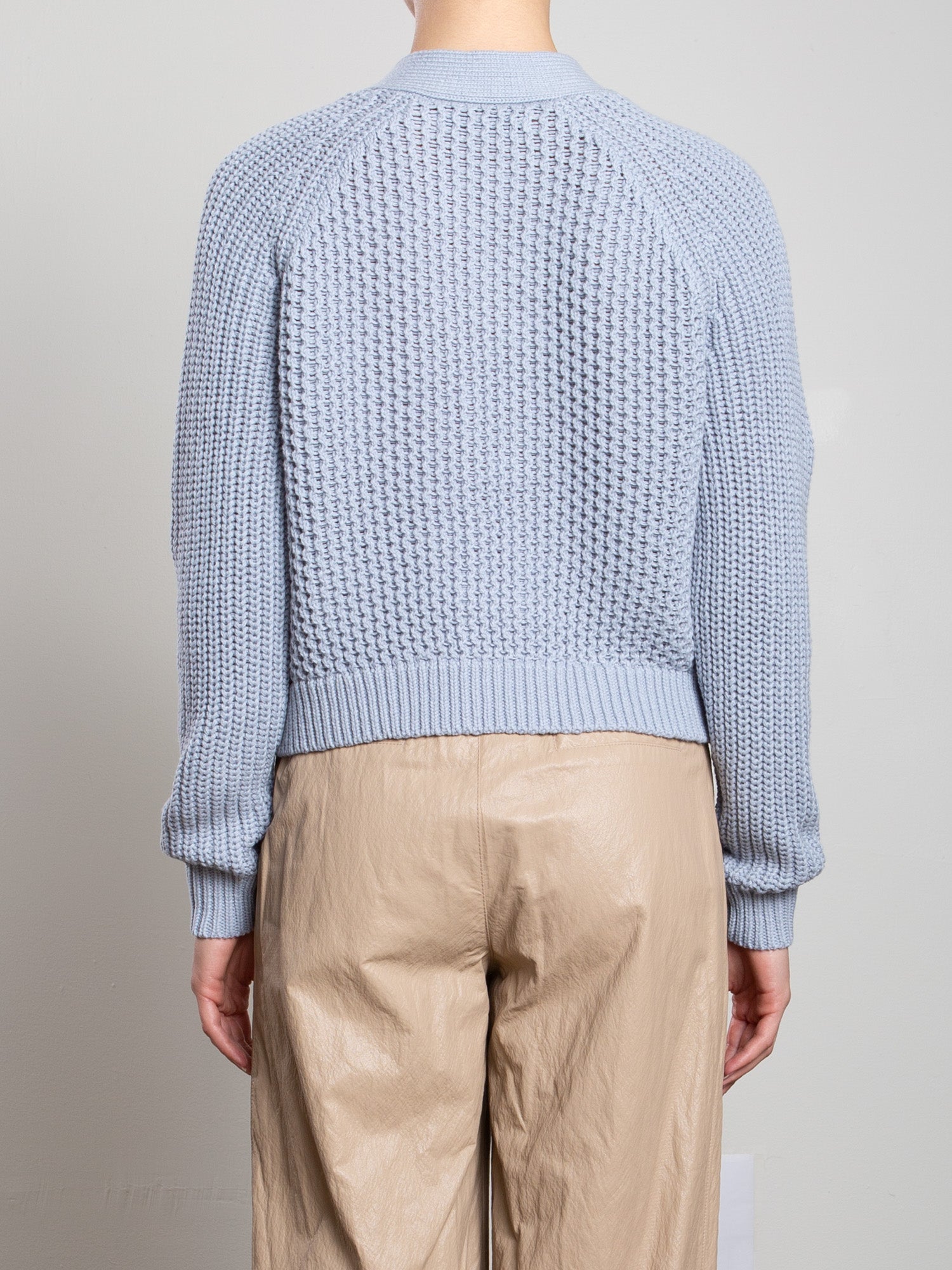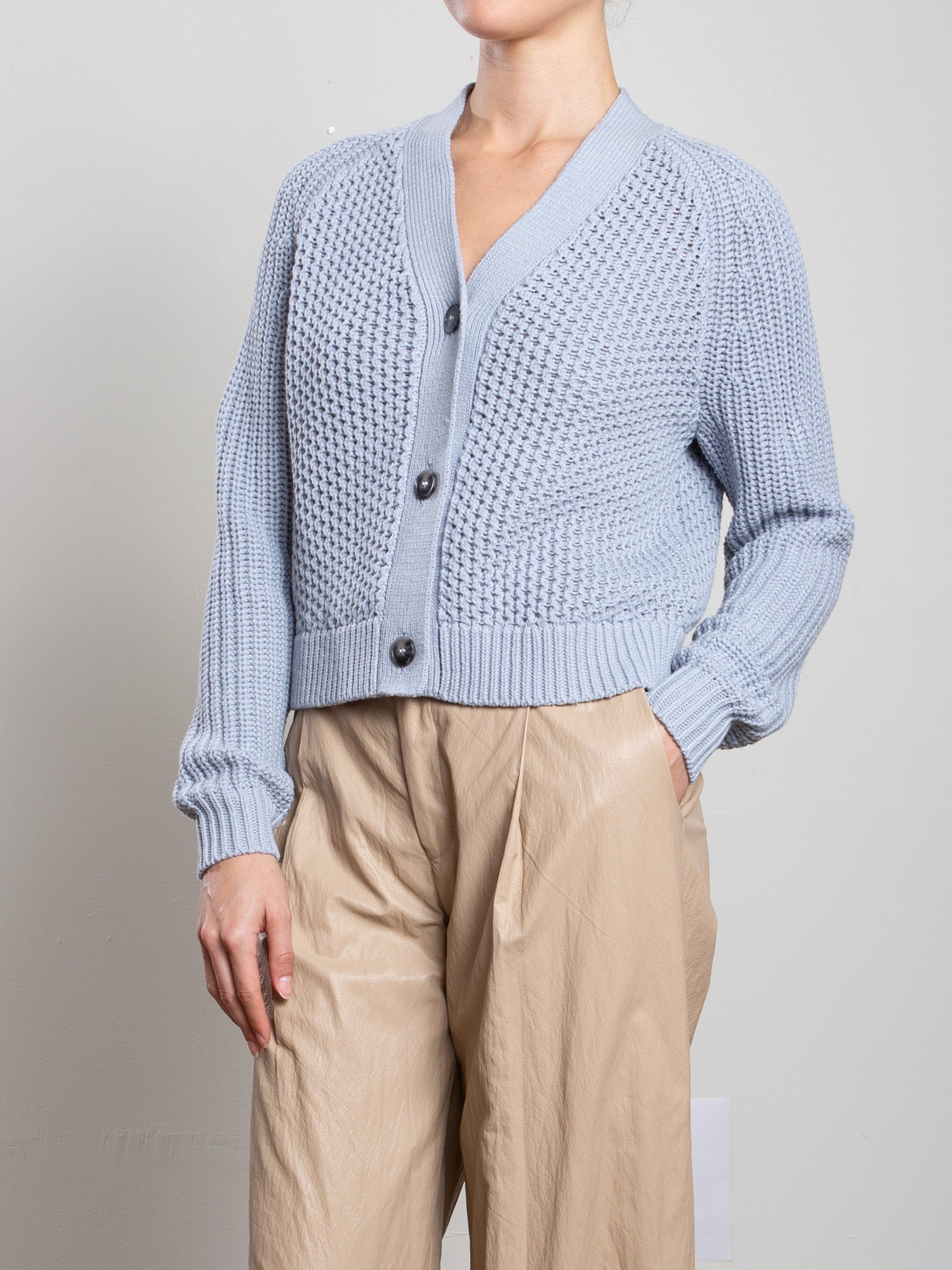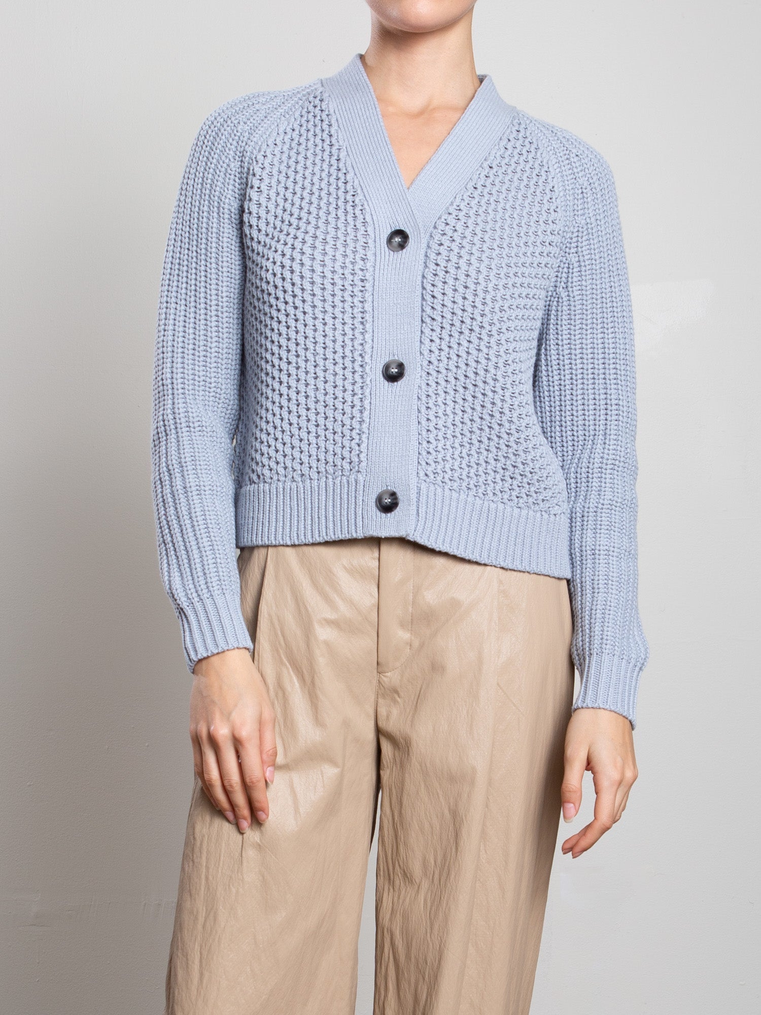 V-neck cardigan with novelty honeycomb stitch in the body and ribbed accents.